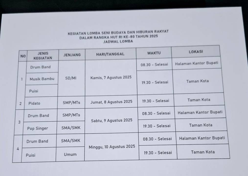 SelengkapnyaJadwal Lomba seni budaya dan hiburan rakyat dalam rangka HUT RI Ke- 80 Tahun 2025.